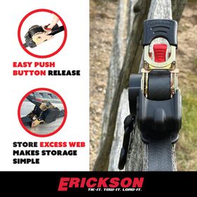 Contrairement aux sangles à cliquet traditionnelles que nous avons tous appris à aimer et sur lesquelles nous comptons pour tous nos besoins d’arrimage, les sangles à cliquet rétractables sont de loin le meilleur choix et nos meilleures vendeuses. Tellement simples à utiliser : il suffit de serrer avec le cliquet, puis pour relâcher, il suffit d’appuyer sur le bouton rouge — et zoom, la sangle se rembobine dans son boîtier de rangement comme un ruban à mesurer. Découvrez nos modèles à boulonner, idéals pour les tableaux arrière de bateaux, les supports de camionnettes, les installations permanentes sur les remorques utilitaires… les possibilités sont infinies. Une fois que vous aurez essayé les sangles rétractables Erickson, vous ne voudrez plus rien d’autre.