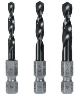 Set de forets hélicoïdaux VARIO 3 pièces dans les tailles #F, 5/16" et 27/64". Longue durée de vie, grâce à la résistance élevée du matériau (64 HRC), aux géométries de coupe spéciales adaptées aux visseuses-boulonneuses à choc et au revêtement. Convient parfaitement aux matériaux suivants : aciers non alliés et alliés jusqu'à 900 N/mm², aluminium et laiton.