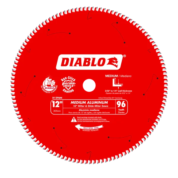 Les lames de scie de nouvelle génération de Diablo pour l’aluminium sont optimisées pour couper les métaux aluminium fins (jusqu’à 1/8”), moyens (3/32”-1/4”) et épais (3/16”-7/16”). Dotées du nouveau carbure Diablo TiCo™ Super-Density Micro-Grain spécialement formulé, ces lames radicales résistent aux impacts, réduisent l’usure, offrent des coupes sans encrassement et durent plus longtemps que le carbure standard dans les applications de découpe de métal. Les dents en carbure spécialement formulées pour la découpe de métal présentent une géométrie de dent Triple Chip Grind (TCG) pour des finitions propres, sans bavure, éliminant pratiquement tout type de retouche. Le brasage Tri-Metal résistant aux chocs permet à ces lames pour aluminium de trancher les matériaux métalliques tout en résistant aux impacts extrêmes pour une durabilité maximale. La série de lames de scie pour aluminium de Diablo est idéale pour les scies filaires et sans fil lors de la découpe sur le terrain de métaux non ferreux tels que les profilés en aluminium, les tuyaux en cuivre, les plaques en laiton, etc.