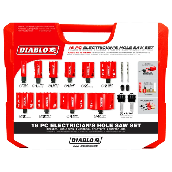 L’ensemble de 16 pièces de scies-cloches bimétalliques Diablo pour électriciens comprend dix scies-cloches bimétalliques, 2 mandrins Snap-Lock Plus™, 2 forets pilotes et 2 écrous adaptateurs (1/2 po et 5/8 po) pour des changements rapides et faciles des scies-cloches, assurant une performance maximale sur le chantier. Ce nouvel ensemble haute performance offre une vitesse de coupe accrue et une productivité supérieure par rapport aux scies-cloches bimétalliques standards. Contrairement à tout ce qui existe sur le marché, les scies-cloches Diablo et le système de mandrin Snap-Lock Plus™ simplifient le processus de fixation pour un montage rapide et efficace.