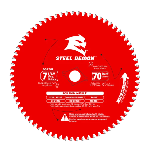 Les lames de scie Steel Demon™ en carbure de Diablo pour métaux fins produisent des coupes rapides et précises dans une large gamme d’aciers doux. Ces lames sont dotées de carbure TiCo™ Haute Densité fabriqué par Diablo, conçu exclusivement pour offrir des performances maximales, des coupes de qualité supérieure et une durée de vie plus longue comparée aux disques de meulage standards. Conçues avec une géométrie Triple Copeaux (TCG) et un revêtement Perma-SHIELD®, ces lames tranchent à travers les métaux les plus résistants pour produire des coupes précises et sans bavures avec moins d’étincelles. Une action de coupe contrôlée produit des copeaux de plus grande taille générant moins de poussières et de contaminants en suspension dans l’air. Le corps à trait de scie mince minimise l’enlèvement de matière et nécessite moins de puissance de coupe, offrant des coupes rapides et propres dans les scies circulaires filaires et sans fil.