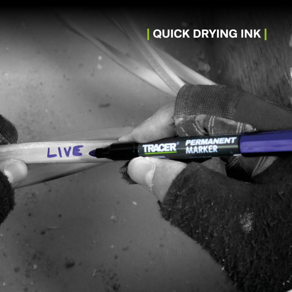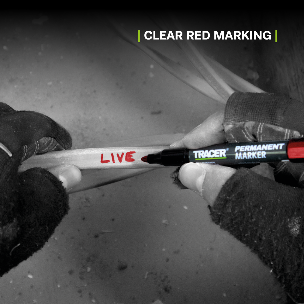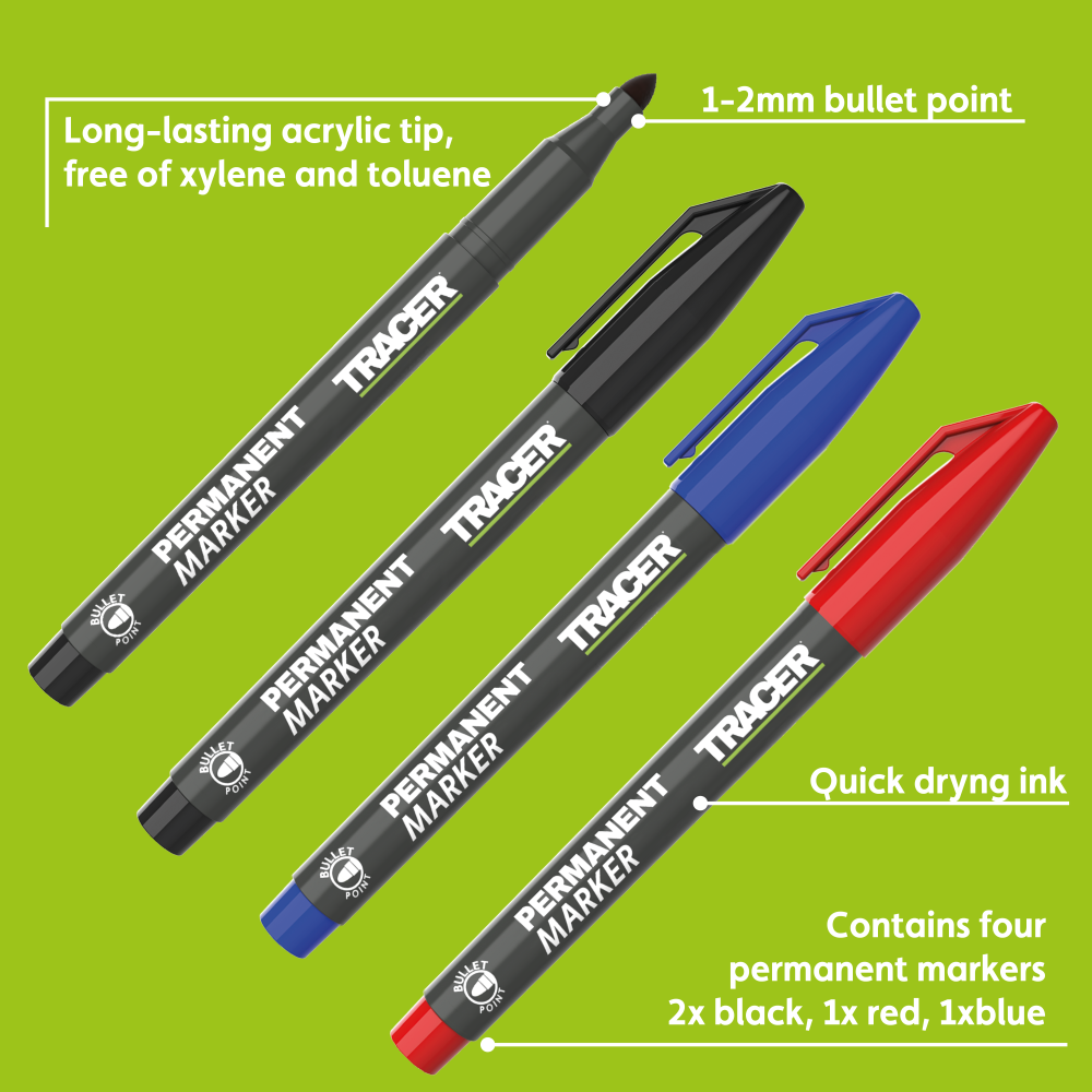 Pack de quatre marqueurs permanents TRACER à pointe ogive de 1 à 2 mm, idéal pour tout marquage général. Le pack comprend : 2 marqueurs noirs, 1 marqueur bleu et 1 marqueur rouge.