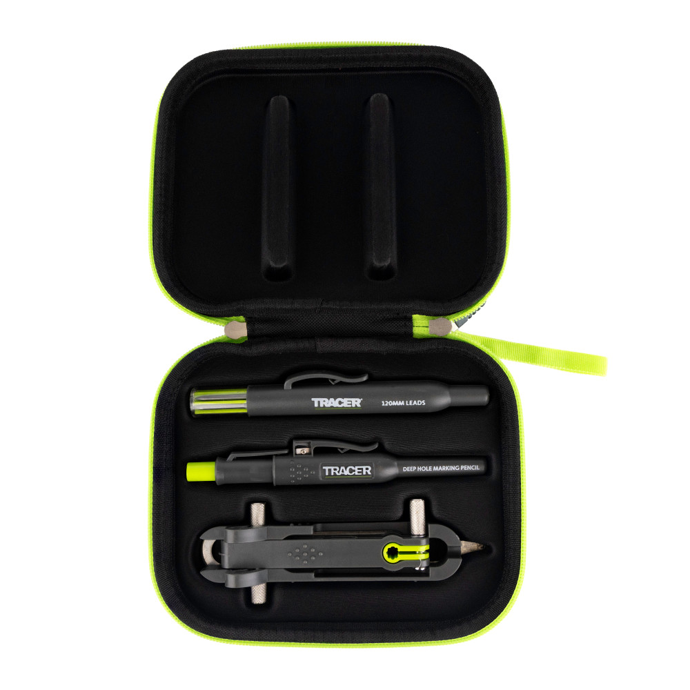 Le kit comprend un marqueur Deep Hole TRACER, des mines de rechange et un étui de chantier, le tout contenu dans un étui de transport de haute qualité.